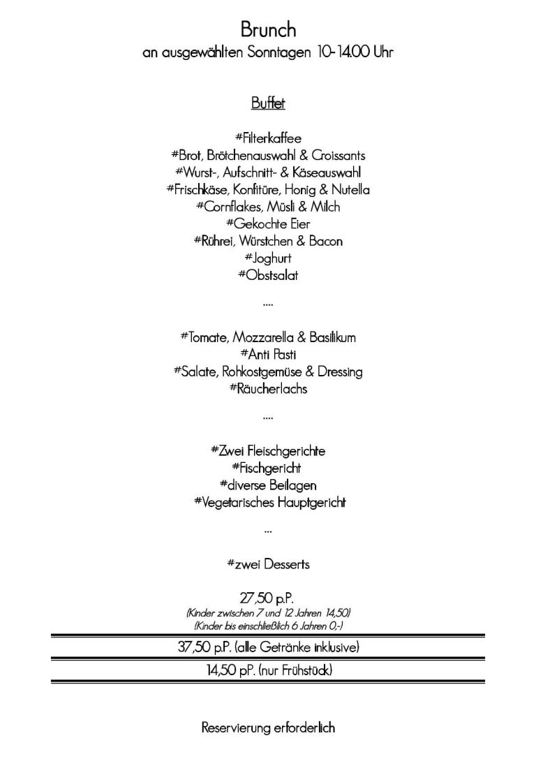 Für unseren Brunch und unsere Special-Abende benötigen wir aus wirtschaftlichen Gründen mindestens 30 vollzahlende Gäste.